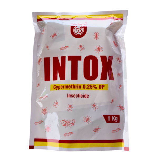 Intox Cypermethrin 0.25% DP (Dusting Powder) is a broad-spectrum, synthetic pyrethroid insecticide used for controlling crawling and chewing insects in agriculture, stored grains, and households. It acts via contact and stomach poison, causing paralysis in pests like termites, ants, cockroaches, and fruit borers. It offers rapid knockdown and long-lasting residual protection, typically applied at 20–25 kg per hectare.
